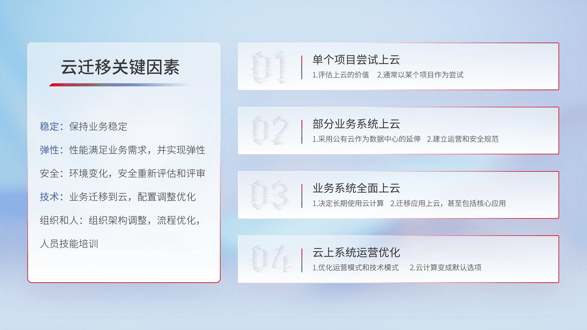 结合实际业务,,从规划设计、、、、云平台选型、、、云原生改造、、、、数据迁移、、集成交付,,,,迁移全过程为客户识别最佳上云路径,,,做好风险识别管理,,设计网络架构、、、、身份权限、、安全审计合规、、、、操作审计、、、日志审计、、监控告警策略、、、多站点容灾设计等,,,对云上基础设施进行整体规划,,,提升IT治理水平,,以满足弹性、、高可用、、、、高性能的需求。。。