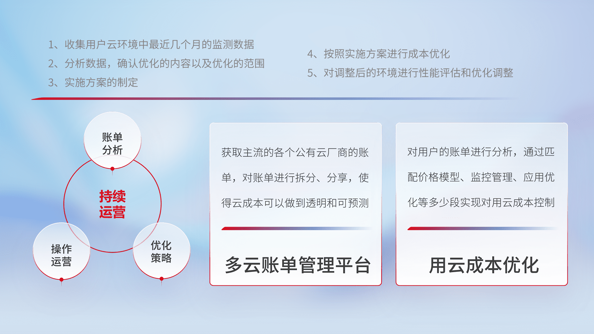 通过多云纳管,,以统一的资源数据模型把客户的云资源进行抽象和封装,,进而实现对多云资源的统一操作,,,保障云资源管理的可靠性、、、稳定性与可用性。。。。量身定制化运维内容,,配置、、开发运维、、、、补丁管理、、、、备份、、、监控、、、认证和访问管理、、、审计和日常巡检等,,,,保障在用云过程中的可靠度,,稳定度以及高可用率。。。